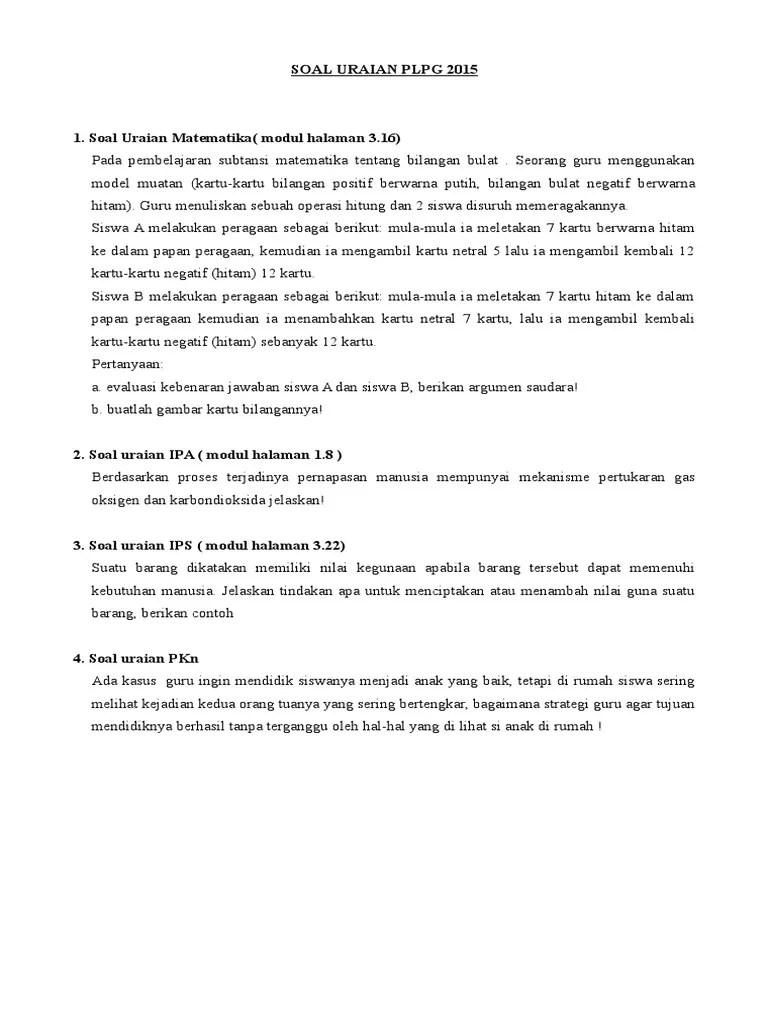Melalui jalur plpg misalnya, kompetensi peserta didik di kembangkan melalui teori dan praktek . Selasa, 6 desember 2016 | 21:05 wib. Downlaod prediksi soal plpg dan kunci jawaban 4 latihan soal doc. Soal ujian tulis nasional (utn) plpg untuk sertifikasi guru ini kami lengkapi dengan kunci jawaban diambil dari. Guru tidak sekedar mengajar, anak tidak sekedar bisa menjawab soal ketika .